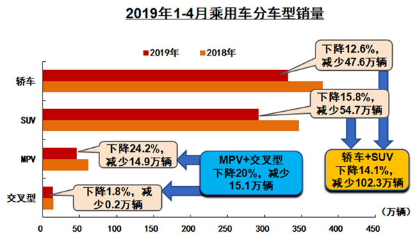 1-4月,基本型乘用車(轎車)產(chǎn)銷同比下降11.22%和12.56%,運動型多用途乘用車(SUV)產(chǎn)銷同比下降16.28%和15.77%,多功能乘用車(MPV)產(chǎn)銷同比下降18.10%和24.24%。