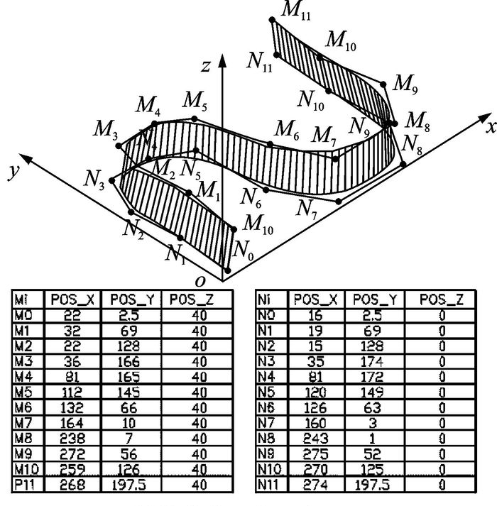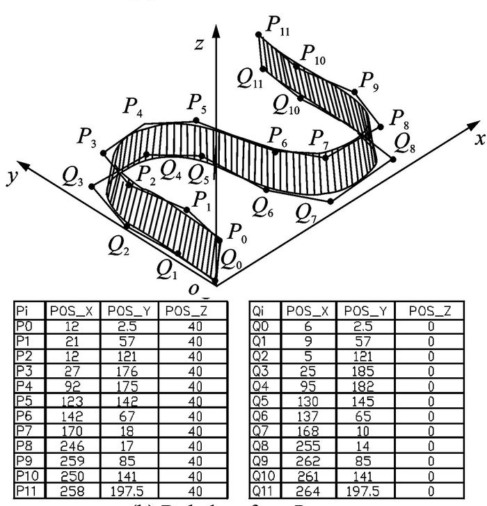 NAS試件主要對機床的幾何精度敏感,而對動態精度不敏感,按照此標準驗收的五軸機床在加工飛機結構零件復雜曲面時,大量出現過切、欠切、表面嚴重波紋等情況。為此,由中國主持修訂、由中航工業成都飛機工業(集團)有限責任公司基于航空制造經驗及多年自主深入研究成果提出的,ISO10791-7: 2020《加工中心檢驗條件第7部分:精加工試件精度檢驗》國際標準,獲國際標準化組織(ISO)批準正式發布,成為國際標準 [16]。如圖20所示,試件由S形走向的扭曲曲面形成的等厚度緣條和矩形底座組成。S型緣條由上下兩個平面上的四條S形曲線相互交叉構成。由于緣條與底平面的夾角連續變化,在連續加工S型曲面緣條兩側時,可檢查五軸數控機床連續變軸加工零件表面時的粗糙度、厚度、輪廓誤差等,檢驗機床開、閉角轉換時的性能,更好地反映多軸加工中各運動部件的綜合精度和動態響應特性,更能體現航空薄壁件的機床加工性能。在圖20中,直紋面A由兩條準均勻三次B樣條曲線定義,這兩條B樣條曲線分別由兩組控制點即Mi(i=0-11)和Ni(i=0-11)定義。與直紋面A相似,直紋面B也由兩條準均勻三次B樣條曲線進行定義,兩條樣條線分別由兩組控制點Pi(i=0-11)和Qi(i=0-11)定義[17]。