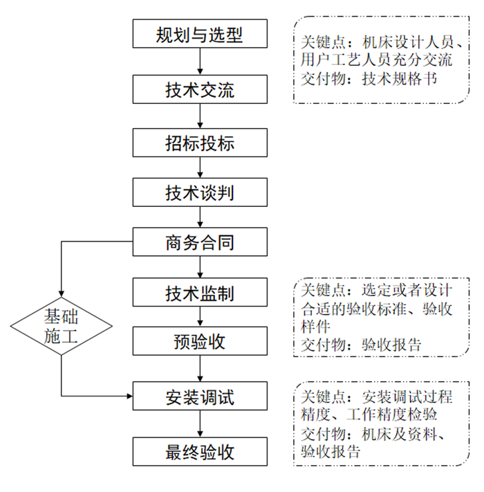 重要的機床與設備采購要經過以下九大環節才能完成驗收(見圖22),機床設計人員應該在設備選型伊始就充分參與進來,并與機床使用的工藝人員充分交流,摸透用戶需求;在機床使用工藝人員要選擇合適的驗收標準,對機床所需的性能進行充分檢驗。