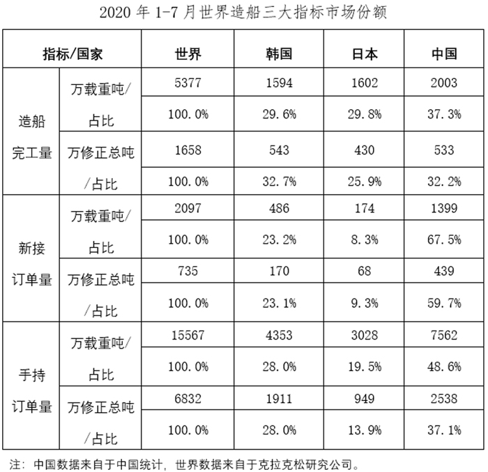 1-7月,我國造船完工量、新接訂單量、手持訂單量分別占世界市場份額的37.3%、67.5%和48.6%。