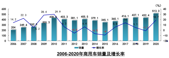 2020年,受國Ⅲ汽車淘汰、治超加嚴以及基建投資等因素的拉動, 商用車全年產銷呈現大幅增長。2020年商用車產銷分別完成523.1萬輛和513.3萬輛,首超500萬輛,創歷史新高,商用車產銷同比分別增長20.0%和18.7%,產量增幅比上年提高18.1個百分點,銷量增速實現了由負轉正。分車型產銷情況看,貨車是支撐商用車增長的主要車型,貨車產銷分別完成477.8萬輛和468.5萬輛,同比分別增長22.9%和21.7%;客車產銷分別完成45.3萬輛和44.8萬輛,同比分別下降4.2%和5.6%。