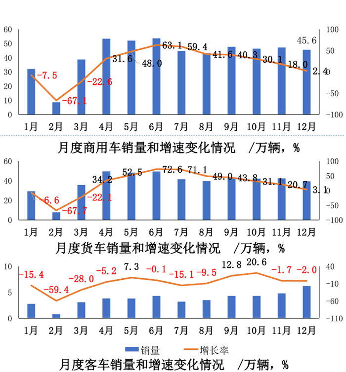 從各月產銷情況來看,商用車從4月開始率先恢復增長,且增速迅猛,并于6月創下歷史新高。12月,商用車產銷分別完成50.9萬輛和45.6萬輛,同比分別增長2.3%和2.4%。
