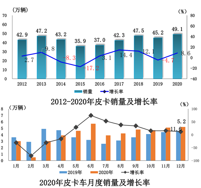2020年,皮卡車產銷分別完成49.2萬輛和49.1萬輛,同比分別增長8.0%和8.6%。分燃料情況看,2020年,汽油車產銷均完成12.3萬輛,同比分別下降5%和3.4%;柴油車產銷分別完成36.8萬輛和36.6萬輛,同比均增長13.0%。