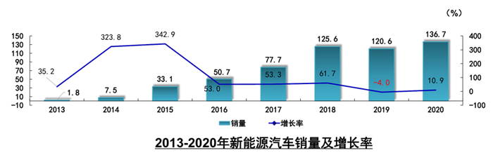 通過多年來對新能源汽車整個產業鏈的培育,各個環節逐步成熟,豐富和多元化的新能源汽車產品不斷滿足市場需求,使用環境也在逐步優化和改進,在這些措施之下,新能源汽車越來越受到消費者的認可。2020年,新能源汽車產銷分別完成136.6萬輛和136.7萬輛,同比分別增長7.5%和10.9%,增速實現了由負轉正。其中純電動汽車產銷分別完成110.5萬輛和111.5萬輛,同比分別增長5.4%和11.6%;插電式混合動力汽車產銷分別完成26萬輛和25.1萬輛,同比分別增長18.5%和8.4%;燃料電池汽車產銷均完成0.1萬輛,同比分別下降57.5%和56.8%。