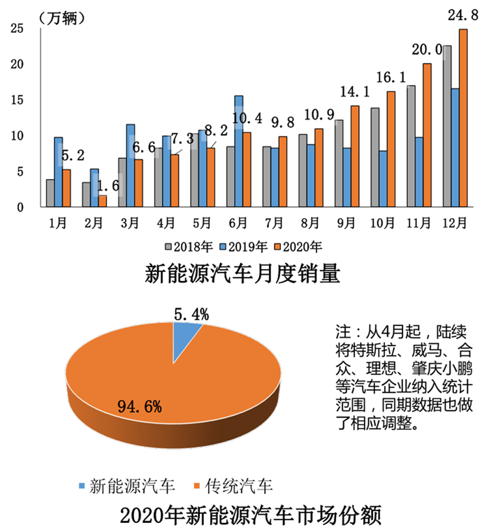 2020年12月,新能源汽車產銷分別完成23.5萬輛和24.8萬輛,同比分別增長55.7%和49.5%。其中純電動汽車產銷分別完成20.3萬輛和21.1萬輛,同比分別增長55.2%和47.5%;插電式混合動力汽車產銷分別完成3.2萬輛和3.7萬輛,同比分別增長69.2%和71.6%;燃料電池汽車產銷分別完成264輛和229輛,同比分別下降81.3%和83.7%。