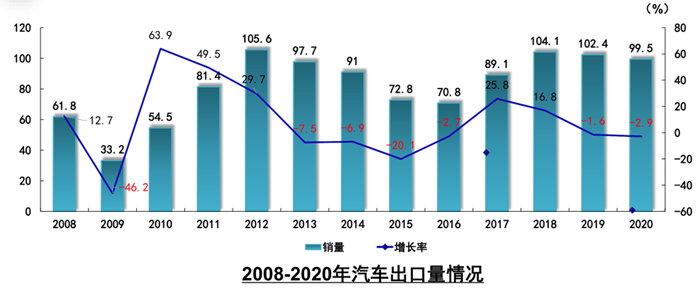2020年,受海外疫情影響,汽車出口呈現下降。全年汽車企業出口99.5萬輛,同比下降2.9%。分車型看,乘用車出口76.0萬輛,同比增長4.8%;商用車出口23.5萬輛,同比下降21.4%。