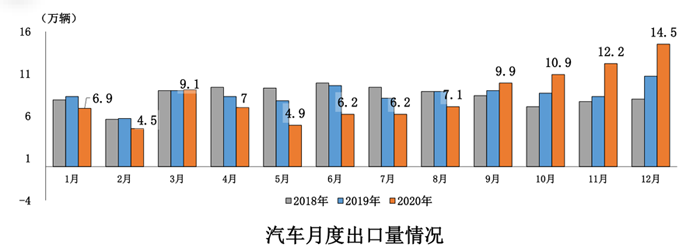 2020年12月,汽車企業出口14.5萬輛,環比增長18.3%,同比增長35.5%,繼11月汽車出口創歷史新高后,本月出口再創歷史新高。分車型看,乘用車本月出口11.6萬輛,環比增長20.8%,同比增長47.2%;商用車出口2.9萬輛,環比增長9.5%,同比增長2.5%。