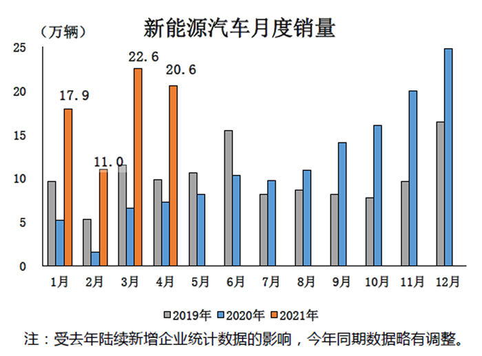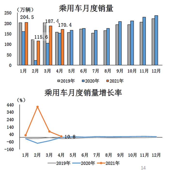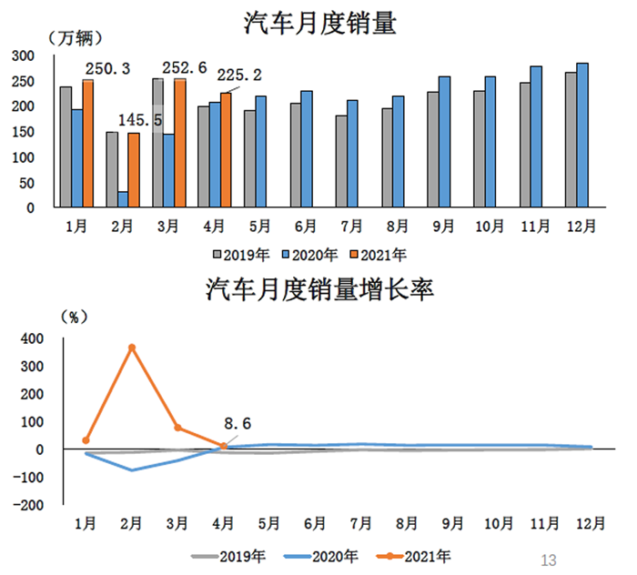 4月,汽車產銷分別達到223.4萬輛和225.2萬輛,環比下降9.3%10.8%,同比增長6.3%8.6%1-4月,汽車產銷858.6萬輛和874.8萬輛,同比增長53.4%51.8%,產銷增速分別較1-3月回落28.3個百分點和23.8個百分點。