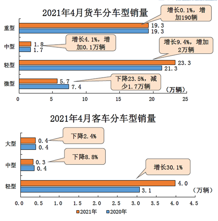 4月,在貨車細分品種中,與上月相比,四大類貨車品種產銷均呈下降;與上年同期相比,輕型貨車產銷呈小幅增長,重型和中型貨車銷量略有增長,產量有所下降,微型貨車產銷均呈較快下降。在客車細分品種中,與上月相比,中型客車產銷均呈增長,大型和輕型客車有所下降;與上年同期相比,輕型客車產銷保持快速增長,大型和中型客車均呈下降。