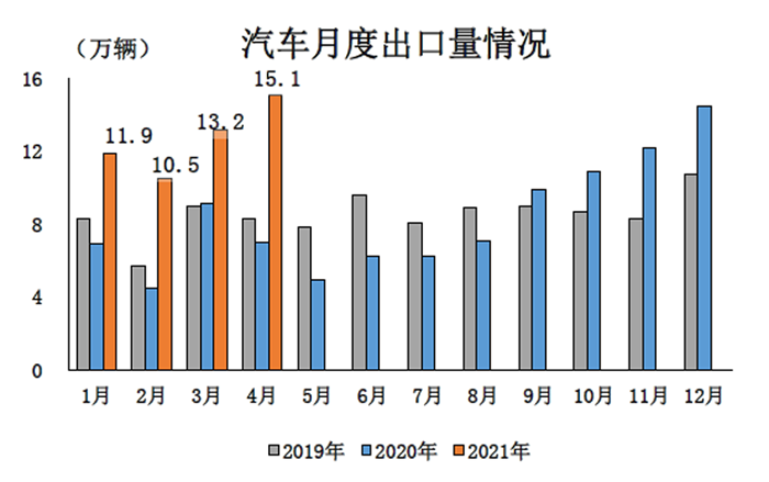 4月,汽車企業出口15.1萬輛,環比增長 13.7%,同比增長1.1倍。本月出口創歷史新高。分車型看,乘用車本月出口11.7萬輛,環比增長17.7%,同比增長1.1倍;商用車出口3.4萬輛,環比增長1.9%,同比增長1.2倍。
