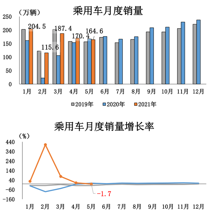 1-5月,汽車產銷分別完成1062.6萬輛和1087.5萬輛,同比分別增長36.4%和36.6%,增幅比1-4月繼續回落17和15.2個百分點。與2019年同期相比,產銷同比分別增長3.6%和5.8%,增幅比1-4月擴大1.5和1.3個百分點。