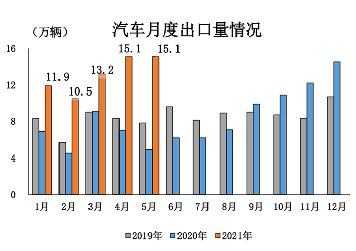 5月,汽車企業出口15.1萬輛,環比下降0.2%,同比增長2.1倍。本月出口繼續刷新當月歷史記錄。分車型看,乘用車本月出口11.5萬輛,環比下降1.4%,同比增長2.3倍;商用車出口3.6萬輛,環比增長3.9%,同比增長1.6倍。