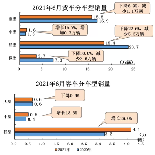 1-6月,商用車產(chǎn)銷同比增長15.7%和20.9%,增速比1-5月回落12.1個百分點和11.0個百分點。與2019年同期相比,產(chǎn)銷同比增長26.7%和31.3%。在商用車主要品種中,與上年同期相比,客車和貨車產(chǎn)銷繼續(xù)保持較快增長。