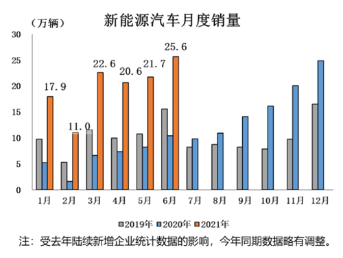 1-6月,新能源汽車產(chǎn)銷雙雙超過120萬輛,同比增長均為2.0倍。與2019年同期相比,產(chǎn)銷同比增長94.4%和92.3%。在新能源汽車主要品種中,與上年同期相比,純電動汽車產(chǎn)銷雙雙超過百萬輛,插電式混合動力汽車銷量超過20萬輛,同比均呈快速增長。燃料電池汽車產(chǎn)銷也結束下降,呈一定增長。