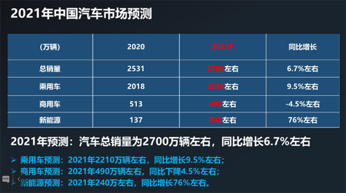 中汽協(xié)預測2021年汽車總銷量為2700萬輛左右,同比增長6.7%左右。