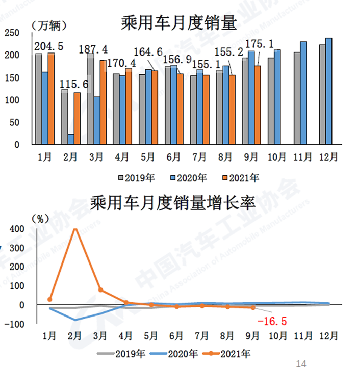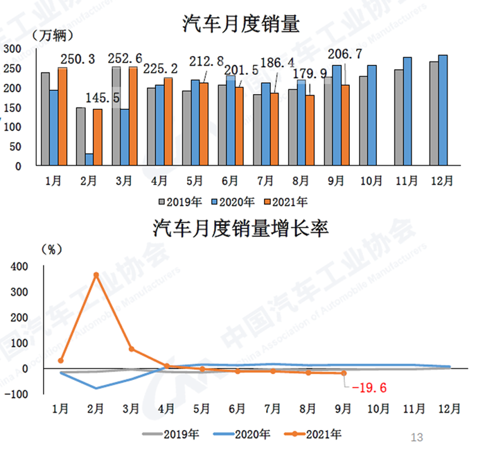 9月,汽車產(chǎn)銷分別達到207.7萬輛和206.7萬輛,環(huán)比增長20.4%和14.9%,同比下降17.9%和19.6%。