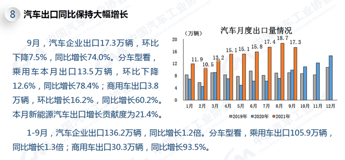 1-9月,汽車產(chǎn)銷1824.3萬輛和1862.3萬輛,同比增長7.5%和8.7%,增速比1-8月繼續(xù)回落。