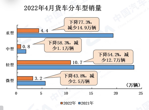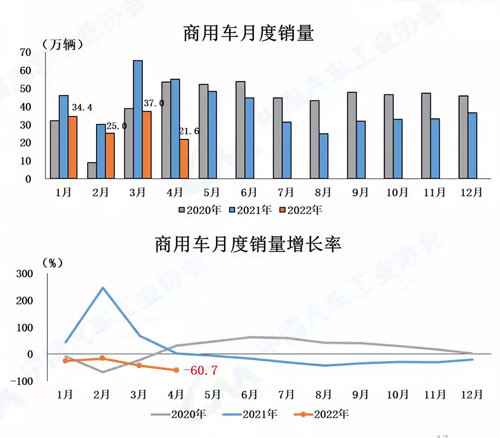 4月,商用車產銷環比下降41.8%和41.6%,同比下降59.8%和60.7%。1-4月,商用車產銷同比下降37.9%和39.8%,降幅比1-3月繼續擴大。