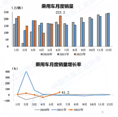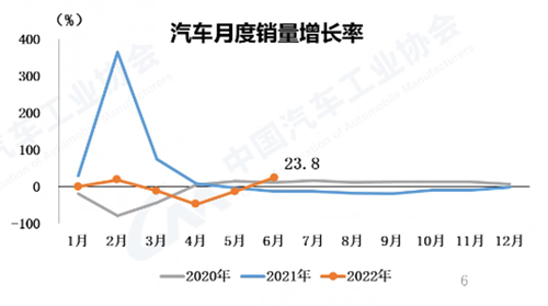 6月,汽車產銷分別達到249.9萬輛和250.2萬輛,環(huán)比增長29.7%和34.4%,同比增長28.2%和23.8%,結束了下降趨勢。