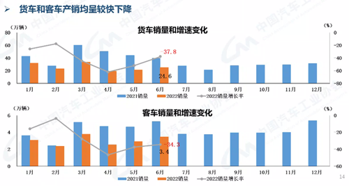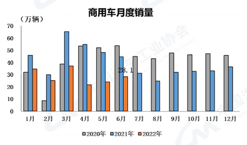 6月,商用車產銷26.1萬輛和28.1萬輛,環(huán)比增長15.7%和17.4%,同比下降33.2%和37.4%。