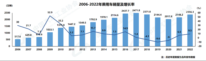 2022年,乘用車產銷分別完成2383.6萬輛和2356.3萬輛,同比增長11.2%和9.5%,增速高于行業總體。在乘用車主要品種中,與上年同期相比,基本型乘用車(轎車)和運動型多用途乘用車(SUV)產銷呈現較快增長,繼續占據主導地位。