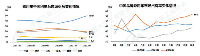 值得關注的是,近年來,中國品牌車企緊抓新能源、智能網聯轉型機遇,推動汽車電動化、智能化升級和產品結構優化,得到廣大消費者青睞。同時,企業國際化的發展更不斷提升品牌影響力。2022年以來,中國品牌乘用車市場占有率一路攀升。2022年中國品牌乘用車銷量1176.6萬輛,同比增長22.8%。市場份額達到49.9%,上升5.4個百分點。