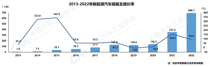 2022年,新能源汽車產銷分別達到705.8萬輛和688.7萬輛,同比增長96.9%和93.4%,市場占有率達到25.6%。