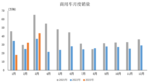 2023年3月,商用車產銷環比分別增長37.1%和34.2%,同比分別增長20.4%和17.4%。2023年1-3月,商用車產銷同比分別下降3.9%和2.9%。