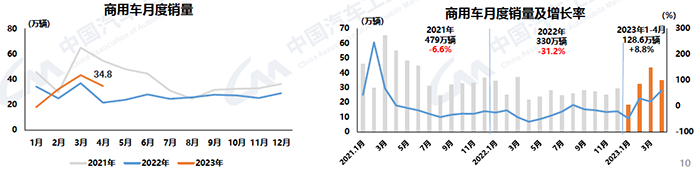 4月,商用車產銷分別完成35.5萬輛和34.8萬輛,環比分別下降18.4%和19.9%,同比分別增長68.8%和60.5%。在商用車主要品種中,與上月相比,客車、貨車產銷均呈兩位數明顯下降;與上年同期相比,客車、貨車產銷均呈快速增長。