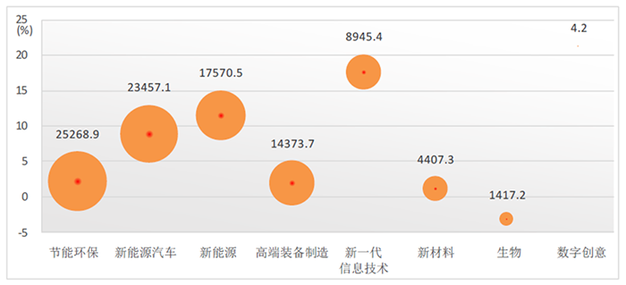 戰新產業大類營業收入情況及同比增速分布(%、億元)