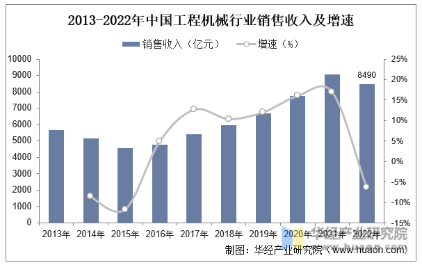 中國市場方面,2013至2022年,我國工程機械行業銷售收入由5663億元增至8490億元,CAGR(復合年均增長率)為4.6%。受宏觀經濟增速放緩、工程有效開工率不足等因素影響,再加上2022年國內工程機械行業處于下行調整期,國內工程機械市場需求大幅減少,2022年工程機械行業銷售收入降至8490億元。隨著我國宏觀經濟政策紅利的釋放,預計2023年工程機械市場有望筑底上行。