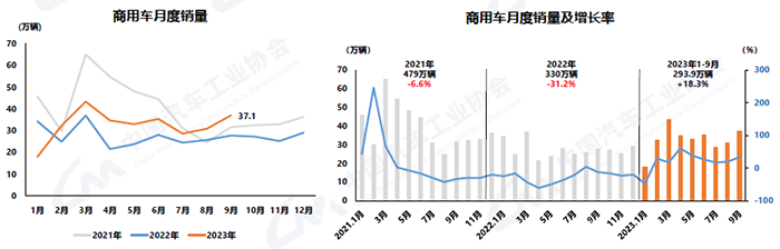 9月,商用車產銷分別完成35.4萬輛和37.1萬輛,環比分別增長17.9%和19.8%,同比分別增長34.6%和33.2%。在商用車主要品種中,與上月相比,客車、貨車產銷均呈兩位數增長;與上年同期相比,客車、貨車產銷均呈不同程度增長。
