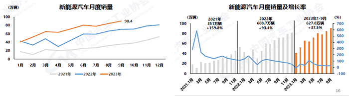 1-9月,新能源汽車產銷累計完成631.3萬輛和627.8萬輛,同比分別增長33.7%和37.5%,市場占有率達到29.8%。在新能源汽車主要品種中,與上年同期相比,三大類汽車產銷均呈兩位數增長。