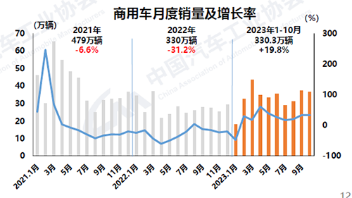 1-10月,商用車產(chǎn)銷累計(jì)完成328.6萬(wàn)輛和330.3萬(wàn)輛,同比分別增長(zhǎng)22.1%和19.8%。在商用車主要品種中,與上年同期相比,客車、貨車產(chǎn)銷均呈兩位數(shù)較快增長(zhǎng)。