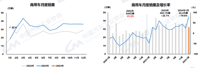 1月,商用車產銷分別完成32.7萬輛和32.4萬輛,環比分別下降10.7%11.1%,同比分別增長66.2%79.6%。在商用車主要品種中,與上月相比,客車和貨車產銷均呈不同程度下降;與上年同期相比,客車、貨車產銷均呈明顯增長。
