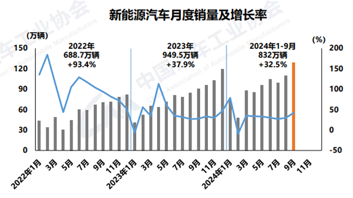 1-9月,新能源汽車(chē)產(chǎn)銷(xiāo)累計(jì)完成831.6萬(wàn)輛和832萬(wàn)輛,同比分別增長(zhǎng)31.7%和32.5%,新能源汽車(chē)新車(chē)銷(xiāo)量達(dá)到汽車(chē)新車(chē)總銷(xiāo)量的38.6%。在新能源汽車(chē)主要品種中,與上年同期相比,三大類(lèi)新能源汽車(chē)品種產(chǎn)銷(xiāo)均呈不同程度增長(zhǎng)。