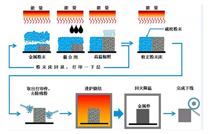 HP Metal Jet是在粉末床上雙向鋪設薄薄的一層微細金屬后,熱噴墨打印噴頭透過該層并噴射黏合劑——水基聚合物液體劑,黏合劑經毛細作用力浸入金屬粉末(0.5-20μm)間隙呈均勻分布,并在高溫輻照下將粉末顆粒熔合在一起成為固體塊,同時溶劑部分揮發,逐層打印,直至結束,取出零件并進爐燒結。HP Metal Jet提供了4倍冗余噴嘴和2倍打印桿,使打印零件的致密度達到93%,生產效率大幅提高,黏合劑用量明顯減少。HP Metal Jet工藝過程如圖5所示。