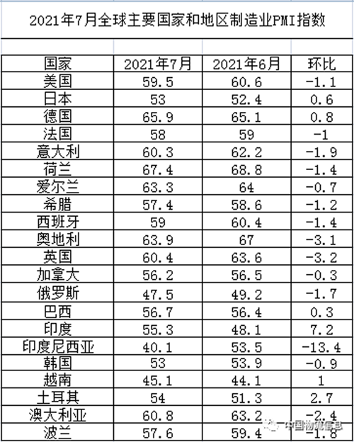 2021年7月份,亞洲制造業PMI為51.2%,與上月持平,結束連續2個月環比下降走勢。從主要國家看,印度制造業有較為明顯的恢復,印度制造業PMI回升至55%以上;馬來西亞和越南制造業PMI雖有小幅回升,但指數仍在50%以下;印尼和緬甸的制造業PMI出現明顯回落;本月,受強降雨和臺風影響,中國制造業增速有所放緩,制造業PMI較上月下降0.5個百分點至50.4%,但經濟整體平穩向好運行基礎沒有發生改變。