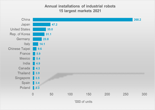 在這一數據背后,中國無疑是最大的亮點。2021年新裝機量遙遙領先于其他國家和地區,并首次在全球市場占比超過50%。體現出中國制造業向自動化發展的迅猛之勢。