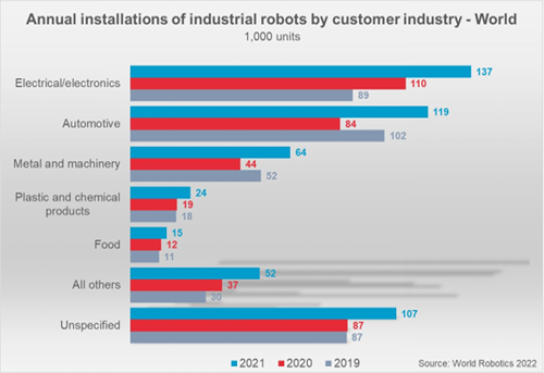 盡管過去兩年因新冠疫情影響,全球制造業供應鏈受到較大沖擊,但2021年主要用戶領域對機器人的需求仍顯示出強勁增長態勢。圖3為近三年全球主要工業機器人應用領域的裝機量,在中國市場的拉動下,電氣/電子行業對機器人的需求量最高,之后依次為汽車、金屬和機械制造1、塑料和化學制品、食品等。