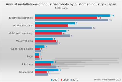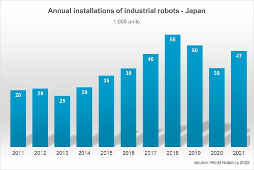2021年,日本繼續成為全球第二大工業機器人市場,雖然20192020連續兩年新機裝機量下降,但2021年實現了22%的增速,達到47182臺;在用保有量為393326臺,同比增長5%。日本不僅是重要的應用市場,也是世界主要的機器人生產國,其2021年工業機器人出口186102臺,達到歷史峰值。