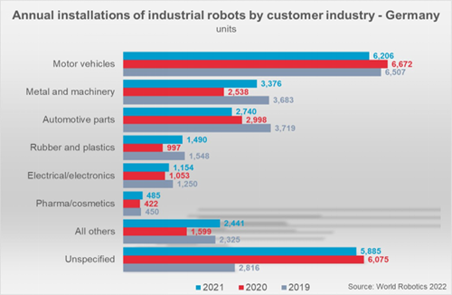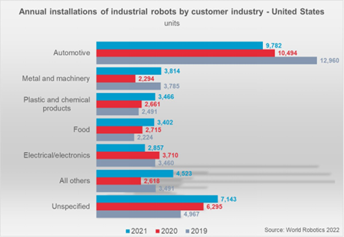 2021年,美國新裝機量為34,987臺,同比增長14%。略高于2019年新冠疫情前33378臺的水平,但仍大大低于201840373臺的歷史高點。汽車工業繼續保持美國第一大工業機器人應用領域,2021年新裝機9782臺,但同比下降了7%,汽車工業對機器人的需求已經連續5年下降。金屬和機械行業是美國工業機器人第二大應用行業,裝機量激增66%,達到3814臺。之后是塑料和化學制品行業,裝機3466臺,同比增長30%;食品和飲料行業裝機3402臺,同比增加25%,也達到了歷史峰值。此外,新冠疫情使醫療衛生領域對機器人的需求日益增長。