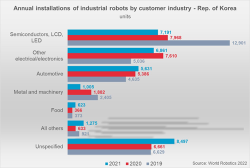 裝機數量連續四年下降之后,韓國在2021年的裝機量達到31083臺,同比增長2%,為全球第四大工業機器人市場。韓國的半導體、電子產業在全球具有很強的優勢,汽車產業也有一定規模,在這些行業的驅動下,韓國工業機器人密度位居全球第一位,2020年為制造業每萬人921臺,遠遠高于第二位新加坡,605/萬人和第三位日本,390/萬人。目前韓國工業機器人保有量為366227臺,同比增加7%