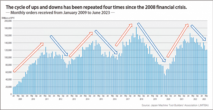 下圖顯示了從2009 年 1 月(美國雷曼兄弟破產引發全球金融危機爆發)到 2023 年 6 月,日本機床行業每月新訂單走勢。從圖中可見,金融危機以來的日本機床訂單經歷了四個起伏周期,四次上升周期(紅色箭頭所示)每個周期持續時間平均約為23.5個月,前三個下降周期(藍色箭頭所示)每個周期持續時間平均約為 21.3個月。從圖中2014年以來趨勢進行分析,訂單走勢從谷底到頂峰需要約兩年時間,再次觸底仍需要約兩年時間。