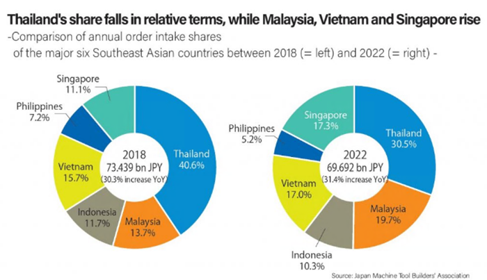 東南亞六個國家中,泰國是機床需求量最大的市場。泰國機床市場的特點是機床進出口對日本的依賴程度較高,大量日本機床制造商和機床貿易公司在泰國設立了生產基地和當地子公司,以滿足當地需求。下面兩張餅圖顯示了2018年(左)和2022年(右)機床行業強勁時來自六國的訂單百分比,泰國在其中都保持了最高份額,但2022年的30.5%較2018年的40.6%,下降了10.1個百分點。同時,馬來西亞、越南和新加坡已成為市場的新來者。尤其是去年來自馬來西亞的機床訂單大幅增長,2018年該國在六國訂單總額中占比13.7%,但去年增加了6.0個百分點,達到19.7%。