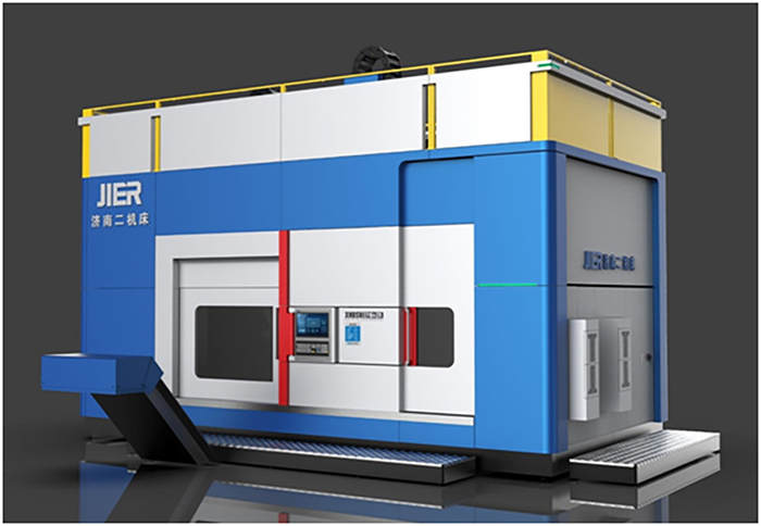 該機是新能源壓鑄車身零件加工專機,配置偏置式雙擺角萬能銑頭、自動翻轉液壓夾具、鼓式直排刀庫,一次裝夾,可實現壓鑄車身結構件正反五面所有加工特征的高速、高精、高效自動加工。4臺CNC設備組線配置,與后續安裝拉鉚、壓鉚螺母、鋼絲螺套工位以及檢測工位等組成一體化車身鋁壓鑄零件加工機裝配生產線,滿足汽車主機廠產能和節拍需求。機床采用高剛度整體框架結構,移動部件采用超輕設計、各軸均采用電機直驅形式,配置鋁合金材質偏置式BC擺頭,提高機床動態性能,直線軸快進速度達到120m/min,加速度達到7m/s。研發自動翻轉工作臺,一次裝夾完成所有要素加工。同時根據零件數模,開展銑削特性研究與機床運動仿真,優化加工工藝路徑,形成總體工藝方案。該產品主要應用在新能源汽車大型壓鑄車身零件的高速高效加工。
