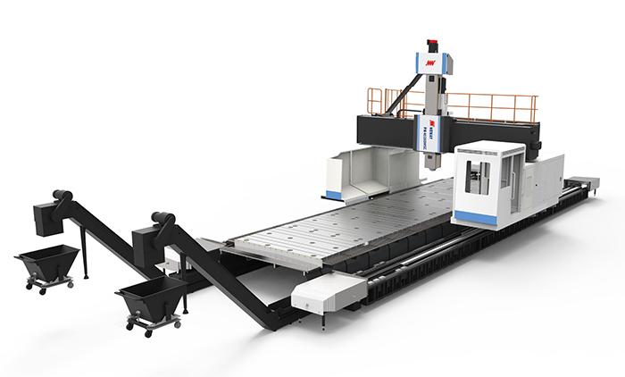 該加工中心工作臺寬度4m,長度6m-26m不等,采用工作臺固定、龍門框架移動的結構,經(jīng)模塊化設計,可根據(jù)客戶和市場需求,對行程、門寬等實現(xiàn)快速定制化生產(chǎn),更適合于大型、重型工件的加工。機床主要基礎結構件采用鑄鐵材質,并根據(jù)實際情況,組合應用熱時效、振動時效及自然時效處理,精度穩(wěn)定性更好。X軸齒輪齒條傳動,雙邊雙驅布局,通過雙電機、雙減速機消隙,配置光柵尺進行雙邊全閉環(huán)同步控制;Y、Z軸采用精密絲杠驅動,結構簡單可靠。滑枕采用四面滑動導軌,主電機及齒輪變速箱置頂,減少發(fā)熱對結構精度的影響。自主開發(fā)了適配的各類型自動銑頭,如全自動直角頭、萬向頭、延伸頭、延伸直角頭等,最小分度角度可達1°。