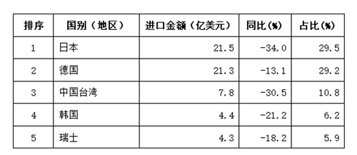 表2 2019年1-12月金屬加工機床進口來源前五位國家和地區