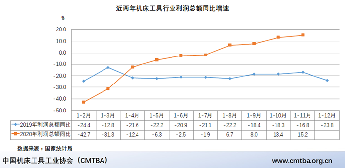 從近兩年機(jī)床工具行業(yè)利潤(rùn)總額同比增速圖可見(jiàn),2019年各月利潤(rùn)總額累計(jì)同比均為降低,2020年7月之前各月累計(jì)實(shí)現(xiàn)利潤(rùn)總額仍同比降低,但降幅逐月明顯收窄,8月之后則已變?yōu)橥仍鲩L(zhǎng),11月累計(jì)實(shí)現(xiàn)利潤(rùn)總額為同比增長(zhǎng)已高達(dá)15.2%。