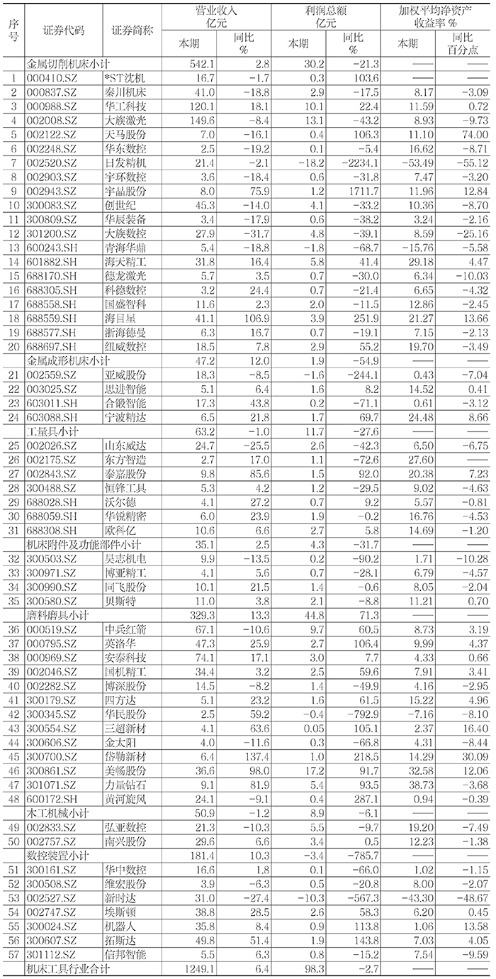 2022年,重點監測的上市公司營業收入整體上保持增長,好于行業整體。重點監測上市公司營業收入同比增長6.4%,行業企業(重點聯系企業數據)的整體營業收入同比基本持平。按營業收入增長率排前三位的分行業是:磨料磨具增長13.3%,金屬成形機床增長12.0%,數控裝置增長10.3%。新能源汽車和動力鋰電池等領域的高速發展,以及光伏和半導體等領域的需求增長,是部分上市公司增長的主要動力。